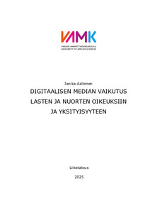 (2025)Tämän opinnäytetyön tavoitteena oli selvittää, miten digitaalinen media vaikuttaa lasten ja nuorten oikeuksiin ja erityisesti heidän yksityisyyteensä. Tutkimuksessa tarkasteltiin myös digitaalisen median käytön riskejä ja ... -