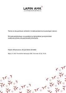 Pohjoisen tekijät - Lapin ammattikorkeakoulun julkaisuja : 45 (Lapin ammattikorkeakoulu, 2023)Digiajan palvelujohtamisen YAMK-koulutuksessa opiskelijat tekevät opinnäytetyönsä monialaisissa pienryhmissä. Näin opinnäytetyöt tarjoavat opiskelijoille ainutlaatuisia oppimisympäristöjä, joissa opiskelijat pääsevät ... -