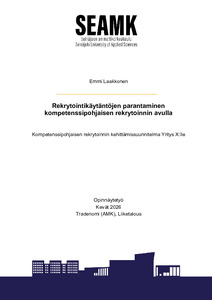 (2026)Tämän opinnäytetyön tavoitteena oli selvittää, kuinka kompetenssipohjainen rekrytointi parantaa rekrytointikäytänteitä. Opinnäytetyö on tehty yhteistyössä Yritys X:n kanssa. Opinnäytetyön tutkimuksen tavoitteena oli ... -