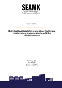 (2026)Opinnäytetyön tavoitteena oli selvittää, miten kehitysvammaisten henkilöiden työtoiminnassa ja vammaisten henkilöiden päivätoiminnassa yksilöllisten tavoitteiden asettelu toteutetaan ja miten yksilöllisten tavoitteiden ... -