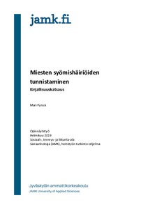 Kehotyytymättömyys on merkittävä syömishäiriön kehittymistä ennustava tekijä. Myös runsas liikunnan harrastaminen, homoseksuaalisuus, päihdeongelmat, korkea koulutus- taso, ylipaino ja traumaattiset kokemukset altistavat syömishäiriöoireilulle. Iän ja syömis- häiriökäyttäytymisen suhde on ristiriitainen, mutta sairastuneen korkeampi ikä ainakin osaltaan hidastaa syömishäiriön tunnistamista. Samoin kuin sairastuneiden kokema stigma, sillä se viivästyttää hoitoon hakeutumista. Tietoutta miesten syömishäiriöistä tulisi lisätä, sillä se helpottaisi syömishäiriöiden tunnistamista niin hoitohenkilöstön kuin mies- ten itsensäkin toimesta. Tiedon lisääminen myös vähentäisi syömishäiriöiden stigmaa. Eating disorders are thought to be young women’s illnesses, although men’s portion of those who get ill is continuously growing. Men’s eating disorders are often left without identification as the symptoms of eating disorders in men and women are so unalike. It’s also common that the health care professionals won’t even consider an eating disorder to be an option with a male patient. The task was to increase the knowledge about eating disorders in men and about the identification of eating disorders to support the health care professionals by collecting the results of resent studies about eating disorders in men. The objective was to promote the identification of eating disorders in men.