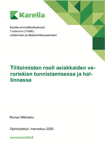 (2025)Opinnäytetyön tavoitteena oli selvittää, miten tilitoimisto voi tunnistaa ja hallita asiak-kaidensa veroriskejä sekä kehittää käytännön toimintamalleja ja työkaluja riskienhallin-nan tueksi. Työn tarkoituksena oli lisätä ... -