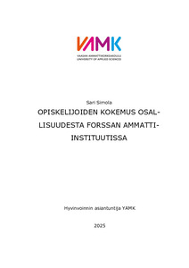 (2025)Tämän kehittämistyön tarkoituksena on selvittää Forssan ammatti-instituutin ammatillista perustutkintoa suorittavien opiskelijoiden kokemusta osallisuudesta oppilaitosympäristössä. Tavoitteena on tuottaa tietoa siitä, miten ... -