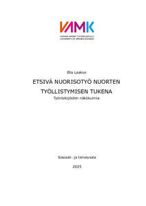 (2025)Tämän opinnäytetyön tarkoituksena oli kartoittaa etsivän nuorisotyön keinoja tukea asiakasnuorten työllistymistä. Opinnäytetyö toteutettiin ammattilaisten eli etsivien nuorisotyöntekijöiden näkökulmasta. Opinnäytetyön ... -