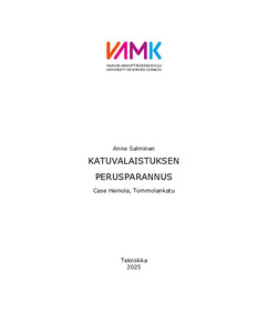 (2025)Opinnäytetyön tarkoituksena on suunnitella Heinolan Tommolankadun katuvalaistuksen perusparannus. Tarve valaistuksen perusparannuksen suunnitteluun on tullut esiin keskusteluissa Heinolan kaupungin edustajien kanssa. ... -