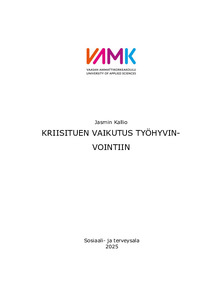 (2025)Opinnäytetyön tarkoituksena oli tutkia kriisitilanteissa toteutuneen kriisituen riittävyyttä ja sen vaikutuksia työhyvinvointiin. Kriisituen vaikutuksia tarkasteltiin sekä toteutuneen että puuttuneen tuen näkökulmasta. ... -