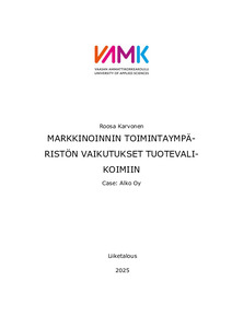 (2025)Tässä opinnäytetyössä tarkasteltiin, miten markkinoinnin toimintaympäristön ulkoiset tekijät vaikuttivat Alko Oy:n tuotevalikoiman strategiseen suunnitteluun. Alko on valtion omistama erityisasemassa toimiva vähittäiskaupan ... -