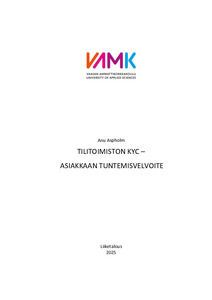 (2025)Laki rahanpesun ja terrorismin rahoittamisen estämisestä muuttui vuonna 2017 luoden tilitoimistoille velvoitteen asiakkaan tuntemisesta ja tunnistamisesta. Lakia on päivitetty vuonna 2019. Opinnäytetyössä perehdytään ... -