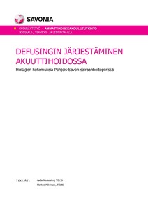 Opinnäytetyön tarkoituksena oli kartoittaa defusingin toimivuutta ensihoitajien ja päivystyksen hoitajien omasta näkökulmasta Pohjois-Savon sairaanhoitopiirin akuuttihoidossa. Tutkimuksen tavoitteena oli tuottaa tietoa defusing-järjestelmän kehittämistä varten. Opinnäytetyöllä haluttiin myös lisätä tietoisuutta defusingista ja rohkaista hoitajia pyytämään ja osallistumaan defusing-istuntoihin. Toimeksiantajana opinnäytetyössä oli Pohjois-Savon sairaanhoitopiiri. Tutkimus oli laadullinen tutkimus, jonka tiedonantajina olivat Pohjois-Savon sairaanhoitopiirin akuuttihoidossa työskentelevät hoitajat. Haastatteluissa tavoitteena oli saada tietoa työntekijöiden omista kokemuksista, ajatuksista ja näkemyksistä. Aineisto on analysoitu induktiivisella sisällönanalysoinnilla ja haastattelut olivat yksilöhaastatteluita.