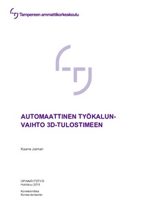 Opinnäytetyön tavoitteena on suunnitella 3D-tulostimeen automaattinen työkalunvaihto, joka mahdollistaa usean eri työkalun käytön tulostettaessa. Työn tarkoituksena oli saada tehtyä toimiva prototyyppi sekä tutkia, minkälaisia työkaluja 3D-tulostimessa mahdollisesti voidaan käyttää.