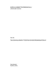 Opinnäytetyö toteutettiin vuosien 2018 ja 2019 aikana. Sen lopputuloksena syntyi taloushallinnon työopas kohdeorganisaatiolle. Produkti eli työopas on luotu mahdollisimman tiiviiksi ja se kattaa kaikki taloushallinnon assistentin kuukausittaiset työtehtävät. Työopas on toimeksiantajan vaatimusten mukainen. Työopas on tehty sähköiseen muotoon ja se on helposti päivitettävissä tulevaisuudessa. The purpose of this thesis was to create financial management instructions for financial management assistant and to support the new employee orientation in target organization. Instructions will speed up the induction of new employee. Target organization required instructions because they did not have any induction material before this thesis.
