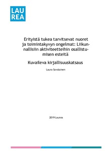 Opinnäytetyön tarkoituksena oli selvittää, millaisia ongelmia erityistä tukea tarvitsevat nuoret kohtaavat vapaa-ajan liikunnallisiin aktiviteetteihin hakeutuessaan sekä osallistuessaan niihin. Opinnäytetyö tehtiin Laurea-ammattikorkeakoulun koordinoimalle Nappi-Hankkeelle, jonka tavoitteena on tarjota Uudenmaan alueen erityistä tukea tarvitseville nuorille liikunnallista elämäntapaa edistäviä lajikokeiluita sekä tukitoimia. Opinnäytetyössä tarkasteltiin erityistä tukea tarvitsevien nuorten kohtaamia esteitä Maailman terveysjärjestö WHO:n kansainvälisen toimintakykyluokituksen viitekehyksessä. Opinnäytetyö tehtiin kuvailevan kirjallisuuskatsauksen menetelmällä ja tietokantahaun avulla saatu aineisto valikoitiin ja analysoitiin deduktiivisesti. Analyysi tehtiin teemoitellen. Opinnäytetyössä erityistä tukea tarvitsevien nuorten osallistumisen esteet jaoteltiin IFC-luokituksen avulla yksilötekijöihin ja ympäristötekijöihin. Alakategorioina käytettiin fyysisiä, sosiaalisia selä asenteellisia ja emotionaalisia tekijöitä. Kirjallisuuskatsauksen tulosten perusteella suurin osa osallistumista estävistä tekijöistä johtuivat ympäristöstä. Muiden ihmisten ja yhteisön asenteet sekä vallitseva, kilpailuun panostava urheilukulttuuri estivät erityistä tukea tarvitsevien pitkäaikaissairaiden ja vammaisten osallistumista yleisiin vapaa-ajan liikuntaryhmiin. Erityisliikuntaryhmiä oli vähän, lajivalikoima oli suppea, ryhmät olivat tarkoitettu vain tietyille erityisryhmille ja vapaa-ajan ohjatut erityisliikuntaryhmät olivat useimmille perheille liian hintavia. Tulosten perusteella näyttäisi siltä, että muuttamalla asenneilmapiiriä ja resursoimalla vapaa-ajan liikuntaa järjestäviä organisaatioita voitaisiin järjestää kaikille nuorille, toimintakyvyn ongelmista riippumatta, iloa tuottavaa vapaa-ajan liikuntaa. Erityistä tukea tarvitseville nuorille tärkeimpiä asioita liikuntaharrastukseen osallistumisessa näyttäisi olevan vapaa-ajan vietto saman ikäisten nuorten kanssa, ystävyyssuhteiden solmiminen sekä rento ja mielekäs yhdessä tekeminen.