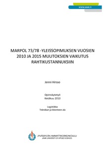 Työn tavoitteena oli avata MARPOL 73/78 -yleissopimuksen tavoitteet, pohtia meriliikenteen ympäristövaikutuksia sekä selvittää, kuinka paljon meriliikenteen kuljetuskustannukset saisivat nousta tulevien määräyksien myötä, jotta se olisi silti maantieliikennettä taloudellisempi kuljetusmuoto.