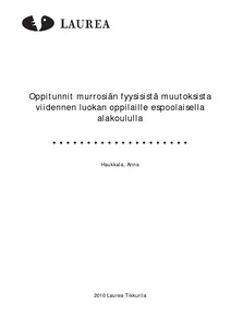 Opinnäytetyön tarkoituksena oli suunnitella ja toteuttaa alakoulun viidennen luokan oppilaille terveyskasvatustunnit murrosiän fyysisistä muutoksista. Työn tavoitteena oli antaa tietoa murrosiän fyysisestä, psyykkisestä, sosiaalisesta ja seksuaalisesta kehitysvaiheesta sekä viidesluokkalaisille että heidän kanssaan työskenteleville. Tekijän tavoitteena oli saada kokemusta varhaisnuorten kanssa toimimisesta ja ryhmänohjauksesta. Tavoitteena oli kehittää valmiuksia suunnitella ja toteuttaa terveyskasvatustilaisuuksia ja luoda oppitunneille selkeä ja ymmärrettävä opetuksen sisältö. Tekijän tavoitteena oli myös onnistua luomaan rauhallinen ja rento oppimisilmapiiri terveyskasvatustunneille, joihin oppilaat kokevat voivansa osallistua kyselemällä ja keskustelemalla.
