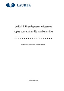 Opinnäytetyön tarkoituksena oli tuottaa opas leikki- ikäisen lapsen ravitsemuksesta somalialaisille vanhemmille. Oppaan tavoitteena on antaa luotettavaa ja konkreettista tietoa somalialaisille vanhemmille leikki- ikäisen lapsen ravitsemuksesta. Maahanmuuttajien määrä on moninkertaistunut viimeisen kahden kymmenen vuoden aikana. Vuoden 2009 lopussa Suomessa asui vakinaisesti 5570 somalialaista, mutta somalian kieltä äidinkielenään puhuvien määrä on 11 681. Siitä huolimatta somaliankielellä on olemassa hyvin vähän ravitsemusneuvonta- materiaalia. Melkein kaikki neuvolassa vanhemmille jaetuista esitteistä ovat suomenkielisiä. Monelle vanhemmalle taas kielimuuri on este tiedon saannille.