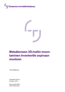Opinnäytetyö tehtiin Nisula Forest Oy:lle. Yrityksellä oli eräs metsäkoneen 3D-malli, joka oli tehty SolidWorksillä. Heillä oli myös valmis prototyyppikone, joka valokuvattiin tarkasti. Tämä 3D-malli muunnettiin Inventorille sopivaksi, koska se on nykyisin käytettävä ohjelma yrityksessä. Joidenkin osien ja kokoonpanojen muuntamisessa oli ongelmia. Inventor ei pystynyt muuntamaan kaikkia osia ja kokoonpanoja. Muunnetusta mallista tehtiin myös kevyt malli, jotta se pyörii sujuvasti tietokoneella ja siihen on silloin helppo sovitella lisävarusteita, kuten puutavaranosturia. Kevyemmästä mallista jätettiin pois ohjaussylinterit ja kuormatilan lisäpankko. Varaosakuvantoja tehtiin vain pääkokoonpanoista. Varaosakuvannoista tehtiin räjäytyskuva, joka siirrettiin piirustuspohjalle. Tähän kuvaan lisättiin osanumerointi ja osaluettelo. Työssä käytettiin tietokonetta, 3D-hiirtä ja Inventor Professional 2019 -ohjelmistoa. Työ tehtiin kevään 2019 aikana Nisula Forestin tiloissa ja laitteilla. Työssä on myös luottamuksellista tietoa, kuten kuvat prototyyppikoneesta, 3D-mallista ja kevyemmistä malleista sekä varaosakuvannot. Luottamuksellinen aineisto on poistettu julkisesta raportista.