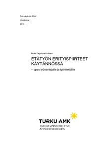 Opinnäytetyön tutkimuksessa tuli myös ilmi, että työnantajan ja työntekijän tulisi aina sopia etätyönä tehtävästä työstä kirjallisesti etätyösopimuksella. Huolellisesti laadittu etätyösopimus poistaa työsuhteesta epävarmuustekijöitä kuten esimerkiksi työvälineiden hankintaan liittyvien kustannusten jakamisen työnantajan ja työntekijän välillä. Opinnäytetyön tutkimuksen perusteella selvisi lisäksi, että, etätyöntekijä voi vähentää henkilökohtaisessa verotuksessaan muun muassa työhuoneesta sekä etätyövälineistä aiheutuneita kuluja. The main goal of this thesis is to prepare a guide for employers, employees who are planning to telework or who are already working remotely. Telework is a form of work where tasks are performed outside of the premises offered by the employer. The subject of this thesis, teleworking and the related special features, was selected by the author's own telework experience and interest.