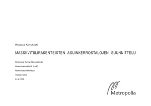 Tämän tutkielman tarkoituksena oli tutustua massiivitiilirakenteen arkkitehtonisiin mahdollisuuksiin asuinkerrostalosuunnittelussa. Arkkitehtonisten mahdollisuuksien lisäksi tutkielmassa selvitettiin massiivitiilirakenteen rakenteelliset mahdollisuudet ja rajoitteet. Tutkielman inspiraationa toimi 1800-luvun lopun ja 1900-luvun alun puhtaaksimuuratut asuinkerrostalot, jotka viehättävät rehellisyydellään ja aistillisuudellaan. Tutkielman pohjalta laadittiin luonnostasoinen suunnitelma kahdesta massiivitiilirakenteisesta asuinkerrostalosta Helsingin Kuninkaantammeen. Asuinkerrostalosuunnitelma on luonteeltaan realistinen, mutta idealistinen. Suunnittelussa on pyritty arkea ylevöittävään sekä tunnelmaltaan lämminhenkiseen ja juurevaan asuinkerrostalokokonaisuuteen.