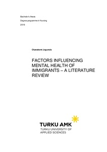 Therefore, government should enact and implement policies that treat immigrants and native equally, prohibit discrimination and improve social integration. There should be education and proper dissemination of information to improve awareness of the immigrants on their mental health. Eurooppaan saapuu maahanmuuttajia, joiden muuttoa edeltävien odotusten ja saapumisen jälkeisen todellisuuden välille jää iso kuilu. Tämä saattaa aiheuttaa stressiä ja ahdistusta, joka voi johtaa mielenterveyden heikkenemiseen, mikäli siihen ei puututa asianmukaisesti. Tämä tutkielma pyrkii löytämään tekijät, jotka vaikuttavat maahanmuuttajien mielenterveyteen, ja osoittamaa mielenterveyteen liittyvät alueet, joihin tulee kiinnittää enemmän huomiota.