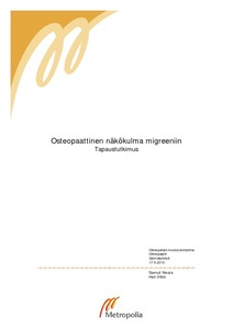 Opinnäytetyön tarkoituksena oli perehtyä migreeniin osteopaattisesta näkökulmasta sekä teoriassa että käytännössä. Kirjallisuuskatsauksen tarkoituksena oli esitellä mahdollisia migreeniin ja sen oireiden kehittymiseen liittyviä osteopaattisia näkökulmia. Käytännön osuus suoritettiin tapaustutkimuksena kahden tutkimuspotilaan avulla. Opinnäytetyö toteutettiin yhteistyössä Suomen Migreeniyhdistys ry:n kanssa. Tutkimuspotilaat hankittiin sähköpostikutsun avulla marraskuussa 2009. Potilasjoukko koostui kahdesta migreenistä kärsivästä henkilöstä. Heitä haastateltiin, tutkittiin ja hoidettiin osteopaattisin menetelmin. Potilaan subjektiivista kokemusta hoidosta ja sen mahdollisesta vaikutuksesta migreenin oireisiin mitattiin viimeisellä käyntikerralla täytetyllä kyselyllä. Hoidot suoritettiin Metropolia ammattikorkeakoulun Hyvinvointi ja toimintakyky-klusterin Positiaharjoitteluklinikalla. Kirjallisuudessa esitetyt osteopaattiset teoriat migreenin etiologisille tekijöille vastaavat hyvin näin pienellä tutkimusjoukolla kliinisessä työssä tehtyihin havaintoihin. Potilaiden päänsäryn voimakkuudessa, tiheydessä ja kestossa havaittiin vähenemistä. Myös lääkkeiden käytön tarve väheni. Potilaat kokivat hoidon miellyttävänä ja kokivat saaneensa apua oireisiinsa. Aihe kaipaa kuitenkin laajempaa, valvottua ja standardoitua tutkimusta validien johtopäätösten tekemiseksi.
