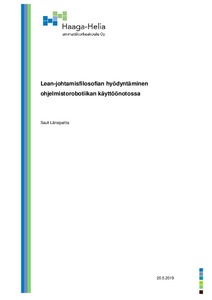 Rutiininomaisten työtehtävien korvaaminen uusien automaatioteknologioiden avulla on yleistynyt Suomessa viime vuosina. Kustannustehokkuuden, aikasäästön ja laadun lisäämisen tarve on herättänyt organisaatioita muuttamaan vanhoja rutiininomaisia työtehtäviään ohjelmistorobotiikan avulla. Ohjelmistorobotiikan käyttöönotto vaatii organisaatiolta läpinäkyvää johtamista ja ketteriä toimintatapoja, jotta käyttöönottoprojektit saataisiin valmiiksi mahdollisimman tehokkaasti ilman pullonkauloja. Tämän opinnäytetyön tarkoituksena on tutkia, miten lean-menetelmää pystytään hyödyntämään ohjelmistorobotiikan käyttöönotossa.
