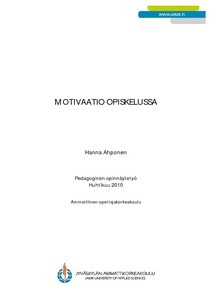 Motivaatio- työväline opiskelussa opinnäytetyöni käsittelee motivaation merkitystä opiskelussa. Sisäisen ja ulkoisen motivaation eroja, sitä kuinka ne vaikuttavat opiskeluun ja mitä hyviä ja huonoja puolia kummassakin mallissa on. Ulkoiseen motivaatioon vaikuttavat ulkopuolelta saatavat palkinnot. Sisäiseen motivaatioon taas vaikuttavat opiskelijan halu oppia ja sisäistää opittava asia ilman ulkoisia palkintoja. Opinnäytetyöni käsittelee myös tavoiteorientaatioita. Tehtäväorientaatio, on malli, jossa opiskelija pyrkii sisäistämään ja ymmärtämään opittavan asian ilman ulkoisia palkintoja tai muita tilannetekijöitä. Suoritusorientaatiossa opiskelija hakee suorituksillaan hyväksyntää, tai koettaa osoittaa kilpailutilanteessa omaa paremmuuttaan. Defensiivisessä orientaatiossa oppija yrittää peittää heikkouksiaan ja osaamattomuuttaan erilaisilla sijaistoiminnoilla.