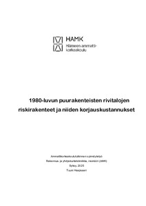 (2025)Tämän opinnäytetyön tavoitteena oli luoda selkeä kokonaiskuva 1980-luvun puurakenteisten rivitalojen yleisimmistä riskirakenteista, niiden korjausmenetelmistä ja korjauksien kustannuksista. Valmiista opinnäytetyöstä on ... -
