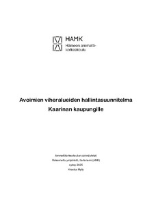 (2025)Tämä opinnäytetyö käsittelee Kaarinan kaupungille kesällä 2025 tehtyä avoimien viheralueiden hallintasuunnitelmaa. Hallintasuunnitelma tehtiin tilaaja tarpeesta ja pyynnöstä opintoihin kuuluvan asiantuntijaharjoittelun ... -