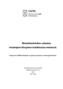(2025)Tässä opinnäytetyössä on tutkittu riistatiheikköjen käytännön toimivuutta talousmetsissä. Työn toimeksi antaja oli HAMK, yhteistyössä Helsingin Yliopiston kanssa. Opinnäytetyön tavoite on saada tieteellistä dataa ... -