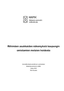 (2025)Tässä opinnäytetyössä tutkittiin Riihimäen asukkaiden mielipiteitä ja tulevaisuuden toiveita lähi- ja virkistysmetsien hoitoon liittyviin seikkoihin. Työn tavoite oli saada tietoa, jonka perusteella voidaan suunnitella ... -