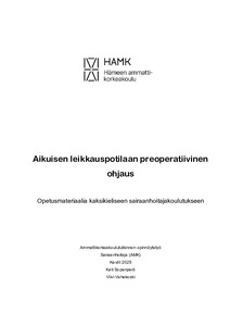 (2025)Opinnäytetyön tarkoitus oli perehtyä ja syventyä leikkauspotilaan preoperatiiviseen ohjaukseen ja luoda opetusmateriaalia kaksikieliseen koulutukseen. Työn tilaajana toimi Hämeen ammattikorkeakoulun sosiaali- ja terveysalan ... -