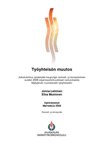 Myllyjärven nuorisokoti tilasi opinnäytetyön, jonka tarkoituksena oli kartoittaa Myllyjärven nuorisokodin työntekijöiden ajatuksia vuonna 2006 alkaneen Jyväskylän kaupungin sosiaali- ja terveystoimen organisaatiomuutoksen jälkeisestä ajasta joulukuuhun 2007 asti. Opinnäytetyö on jatkotutkimus Kivimäen ja Peltosen (2007) opinnäytteelle, joka käsitteli organisaatiomuutoksen myötä syntynyttä Myllyjärven nuorisokodin uutta työyhteisöä. Laadullisessa opinnäytetyössä selvitettiin ryhmähaastattelujen ja kyselylomakkeiden avulla, miten Myllyjärven nuorisokodin työyhteisön muutos näkyi työtehtävissä, työyhteisössä, johtajuuden toteutumisessa sekä työssäjaksamisessa ja miten muutoksesta oli selvitty. Lisäksi opinnäytetyössä tarkasteltiin työntekijöiden ajatuksia kuluneesta vuodesta, tulevaisuuden näkymistä sekä muutosta koskevista tutkimuksista. Haastatteluissa esiintyi runsaasti erilaisia vastauksia ja näkökulmia. Muutoksen koettiin lisänneen työn määrää kehittämisen ja uusien työtapojen myötä, perustyön kuitenkin säilyessä samana. Suurin osa tutkimukseen osallistuneista koki työyhteisön kehittyneen ja ilmapiirin parantuneen, mutta yhteisen linjan toivottiin yhä kehittyvän. Lisäksi esiin nousi työntekijöiden motivoituneisuus työyhteisön ja uusien työtapojen kehittämiseen. Vastaajat kertoivat johtajuuden toteutuneen vaihtelevasti ja olleen epävarmaa, mihin myös johtajuuden jakautuminen oli vaikuttanut. Suuri osa tutkimukseen osallistuneista kertoi muutoksen vaikuttaneen työssäjaksamiseen ja selviytymiskeinoina valtaosa mainitsi työyhteisöstä saadun tuen sekä yksityiselämän. Edelliseen tutkimukseen verrattuna työyhteisön kehitys oli nähtävissä ja työyhteisön kulttuuri oli alkanut muotoutua.