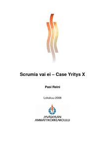 Erilaisista ohjelmiston kehitysmenetelmistä on tullut merkittävä ohjelmistojen laatua ja ohjelmistokehityksen tuottavuutta parantava tekijä. Perinteisiin suunnittelumenetelmiin kuuluu vesiputousmalli. Viime aikoina ohjelmistonkehityksessä huomiota on saanut agile Software Development (ketterä kehitys), jonka eräitä metodeja ovat XP (Extreme Programming) ja Scrum. Tämän opinnäytetyön tutkimuksen kohteena on Scrum-menetelmä, joka raportoidaan yksityiskohtaisesti lukijalle. Tässä opinnäytetyössä käsitellään myös ohjelmistotuotannon ja ohjelmistoprojektin käsitteitä. Tiedonhankintamenetelminä käytetään perehtymistä ohjelmistotuotannon lähdeteoksiin ja artikkeleihin. Toteutettiin tutkimus informaatioteknologiaorganisaatioon. Tutkimuksen kohderyhmänä oli yrityksen sovelluskehitystiimi. Tutkimusmenetelmänä käytetään kyselyä. Tutkitaan yrityksen tuotekehitysprosessien dokumentteja. Viimeinen vaihe tutkimuksessa oli haastatella sovelluskehitystiimin johtajaa. Yhtenä tuloksena raportoitiin yrityksen tuotekehitysprosessi. Raportoitiin erot yrityksen tuotekehitysprosessin ja Scrumin väliltä. Mitä organisaation tulisi muuttaa tuotekehitysprosessissaan, jotta se olisi Scrumin mukainen. Viimeiseksi neuvoteltiin sovelluskehitystiimin johtajan kanssa, onko Scrum sopiva menetelmä yritykselle. Tutkimuksen kohde organisaatio voi käyttää tämän opinnäytetyön tuloksia tutkimalla miten Scrumia pitäisi muuttaa, jotta se sopisi organisaation ohjelmistotuotekehitykseen. Tuloksia ei voida yleistää, koska kyseessä on tietyn organisaation toiminnan tutkiminen.