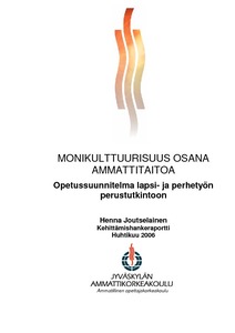 Monikulttuurisuus osana ammattitaitoa on Jyväskylän ammattikorkeakouluun, ammatilliseen opettajakorkeakouluun laadittu kehittämishanke. Sen tavoitteena oli tuottaa lapsi- ja perhetyön perustutkinnon opetussuunnitelmaan monikulttuurisessa työympäristössä toimimisen opintokokonaisuus, joka on laajuudeltaan 10 opintoviikkoa. Kehittämishankkeessa oli tavoitteena tuoda esille monikulttuurisuuden merkitys yhteiskunnassa ja sen vaatimukset ammatilliselle koulutukselle. Tavoitteena oli myös perehtymällä valtakunnalliseen ja oppilaitoskohtaiseen opetussuunnitelmaan koota lastenohjaajakoulutuksen kannaltaoleelliset asiat, jotka oli otettava huomioon, kun tuotettiin monikulttuurisessa työympäristössä toimimisen opintokokonaisuutta. Opintokokonaisuus sovitettiinyhteen oppilaitoskohtaista opetussuunnitelmaa tekevän työryhmän ja lastenohjaajakoulutukseen opetussuunnitelmaa tekevän tiimin kokouksissa esiin tulleiden ajatusten kanssa. Opintokokonaisuus tuotettiin lähtökohtana lastenohjaajan tarvitsemat taidot monikulttuurisessa työympäristössä ja suvaitsevaisuuteen kasvattamisessa. Tavoitteita, sisältöjä, opetusmenetelmiä ja oppimateriaalia testattiin käytännön opetustyössä, ja niistä keskusteltiin myös työyhteisön kanssa. Kehittämishankkeen tuloksena on tavoitteenmukaisesti ehdotus monikulttuurisessa työympäristössä toimimisen opintokokonaisuudeksi Sisälähetysseuran oppilaitoksen lapsi- japerhetyön perustutkinnon opetussuunnitelmaa varten. Tarkoitus on, että ehdotus voidaan liittää oppilaitoksen opetussuunnitelman osaksi ja että sitä voidaan käyttää lastenohjaaja-opiskelijoiden ammatillisessa koulutuksessa. The aim of the study of Monikulttuurisuus osana ammattitaitoa is to produce syllabus for multicultural studies in the curriculum of Vocational Qualification in Child Care and Education and Family Welfare education. These studies consist of 10 study credits that prepare children's instructor students to work in a multicultural environment. One of the goals was to high light the meaning ofmulticulturalism in the society and its demands to vocational education. The other goal was to bring together the most significant issues considering children's instructor education considering studies of working in a multicultural environment on the basis of state level curriculum of vocational qualifications. The compatibility of syllabus of working in a multicultural environment with the college's curriculum was checked in the meetings with curriculum teams of the college. The basis for the syllabus was to emphasize the skills that children's instructor needs while working in a multicultural environment and while giving intercultural education to the children. The goals, the content, the teaching methods and the study material were tested in practise by using them in teaching, and the suitability of them was discussed with other teachers of the college. The result of the study is, as aimed, a proposal for syllabus for multicultural studiesin the curriculum of Vocational Qualification in Child Care and Education and Family Welfare education in Sisälähetysseuran Oppilaitos. The purpose is that theresult of the study, the proposal of the syllabus can be attached as a part of the curriculum and be used as part of the vocational education of the children'sinstructor studies.