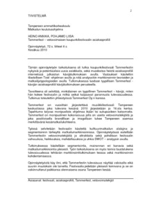 Työssä selvitetään festivaalin käsitettä kulttuurimatkailun alalajina ja segmentoinnin tärkeyttä matkailumarkkinoinnissa. Opinnäytetyössä esitellään Tammerfestin vetovoimatekijöitä ja attraktioita sekä pohditaan festivaalin vahvuuksia, heikkouksia, mahdollisuuksia ja uhkia SWOT – analyysin avulla.