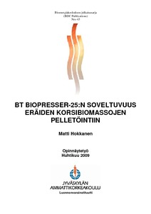 Työ toteutettiin Jyväskylän ammattikorkeakoulun Bioenergiakeskuksen toimeksiannosta yhteistyössä Manelius Management Oy Ab:n kanssa. Yrityksen toimialaa ovat rypsiöljypuristimet, öljypuristinasemat ja pellettipuristimet. Työn tavoitteena oli tutkia ruokohelven, rypsin oljen, lajittelutähteen ja sahanpurun pelletöitävyyttä BT Biopresser-25