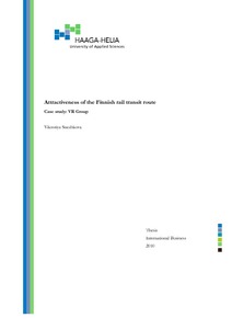The thesis had practical importance for the commissioning party because it has revealed level of attractiveness of the railway transit route, defined advantages and disadvantages of the Finnish transit route and suggested the need for cooperation between the Finnish freight providing companies in order to increase attractiveness of the entire route via Finland. Besides, the thesis defined main factors affecting the transit route choice for raw bulk materials transporta-tion. Attractiveness of the railway transit route can be increased also by influencing those factors. Therefore, findings of the research can be used by VR Group as background for the creation of international strategy, directed at increasing attractiveness of the railway transit route via Finland for the transportation of raw materials from Russia westbound.