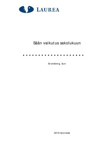 Tässä työssä on käsitelty sääolosuhteiden, kuten sademäärän ja lämpötilan vaikutusta kevätvehnän sakoluvun muutoksiin. Työn tarkoituksena oli löytää riippuvuuksia sääolosuhteiden ja sakoluvun välille. Sain aiheen ollessani erikoistumisharjoittelussa MTT:n Piikkiön koeasemalla. Suomen ilmasto on leudompi kuin useimpien muiden samalla leveyspiirivyöhykkeellä sijaitsevien maiden. Suomen ilmaston peruspiirre on vaihtelevuus, niin vuorokaudessa, vuosissa kuin vuosikymmenissä.Suomen keskilämpötilan arvioidaan kohoavan vuoteen 2080 mennessä 2 – 4 astetta. Keskimääräisen sademäärän arvioidaan kasvavan 15 - 25 % ja samalla sääilmiöiden äärimuodot kuten myrskyt, kuivuusjaksot ja rankkasateet runsastuvat. Sadepäivien määrä kasvaa 5 – 18 %. Suurimmat vuorokautiset sademäärät kasvavat 10 - 20 %, joidenkin kokeiden mukaan jopa