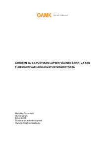 (2025)Käsittelin opinnäytetyössäni 0–3-vuotiaan lapsen ja aikuisen välistä leikkiä ja sen tukemista varhaiskasvatuksessa. Tämän opinnäytetyön aiheena on 0–3-vuotiaan lapsen ja aikuisen välinen leikki ja sen tukeminen ...Avoin saatavuus / Open access / Öppen tillgång -