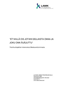 Mieskaveritoiminta on Pienperheyhdistys ry:n perustama vapaaehtoistyön toimintamuoto, jota Päijät-Hämeessä koordinoi Lahden ensi- ja turvakotiyhdistys ry. Toiminnan tarkoituksena on tarjota ilman isää kasvavalle lapselle mahdollisuus tutustua tavallisen miehen elämään ja mahdollistaa äidille pieni hengähdystauko arjessa. Opinnäytetyön tavoitteena oli selvittää yksin lastaan kasvattavien äitien kokemuksia Mieskaveritoiminnasta Päijät-Hämeen alueella. Opinnäytetyön tarkoitus on lisätä ymmärrystä toiminnassa mukana olevien äitien kokemuksista, kehittää Mieskaveritoimintaa ja lisätä toiminnan tunnettavuutta.