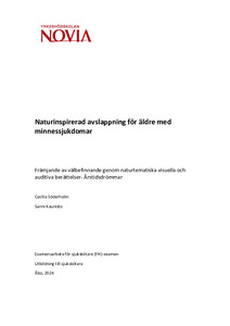 (2024)Naturen kan användas inom vården av personer med minnessjukdomar, både direkt och indirekt. Olika former av naturterapier, särskilt de med avslappnande syfte, har blivit alltmer populära inom vissa vårdformer och har ... -