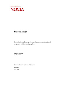 (2025)Examensarbetets syfte är att undersöka hur professionella inom småbarnspedagogiken bemöter barn i sorg, hur de får kännedom om att ett barn befinner sig i sorg samt om de upplever behov av ytterligare kunskap inom området. ... -
