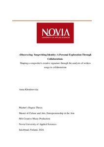 (2024)This thesis explores the transformative journey of a songwriter through collaboration. Over the course of this research, I collaborated with more than 11 producers and top liners from around the world, creating 13 songs ... -