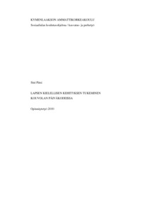 Opinnäytetyön aiheena on lapsen kielellisen kehityksen tukeminen päivähoidossa. Työn päätavoitteena oli selvittää, miten tukeminen toteutuu Kouvolan kaupungin päiväkodeissa ja mitä menetelmiä käytetään kielihäiriöisten lasten tukemisessa. Tutkimuksen tarkoituksena on auttaa päivähoitoa ymmärtämään erilaisten tukitoimien merkitys lapsen kielellisten häiriöiden kuntoutuksessa.