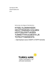 Tämän opinnäytetyön tarkoituksena oli luoda kyselylomake kolmen hoitosuosituksen toteuttamisesta ja tunnettavuudesta. Opinnäytetyö tehtiin kuvailevana kirjallisuuskatsauksena. Käsiteltävät hoitosuositukset olivat: Omahoidon ohjauksen sisällöt sydämen vajaatoimintapotilaan hoitotyössä, Painehaavan ehkäisy ja tunnistaminen aikuispotilaan hoitotyössä sekä Aikuispotilaan kirurgisen toimenpiteen jälkeisen lyhytkestoisen kivun hoitotyö. Näiden hoitosuositusten keskeisimmät sisällöt avattiin ja niiden pohjalta kehitettiin strukturoitu kyselylomake. Lisäksi julkaisuja (n=45) hoitosuositusten tunnettavuudesta ja toteuttamisesta haettiin sydämen vajaatoiminnan, painehaavojen sekä kivun aihealueista, mutta myös yleisesti hoitosuosituksista vastaten opinnäytetyön tutkimuskysymyksiin. Tavoitteena on edistää näiden hoitosuositusten tunnettavuutta ja yhtenäistää hoitokäytänteitä. Opinnäytetyö on toteutettu osana Varsinais-Suomen sairaanhoitopiirin STEPPI-hanketta.