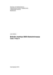 Tämän opinnäytetyön aiheena oli brändin ja asiakaspolun tutkiminen B2B-liiketoiminnassa. Opinnäytetyö toteutettiin yritykselle X ja tutkimuskohteena oli case-yrityksen asiakkaiden mielikuvat yrityksestä ja sen brändistä sekä heidän kulkemansa polku yrityksen palveluiden piiriin. Tavoitteena oli selvittää, oliko case-yrityksestä muodostunut jonkinlainen mielikuva asiakkaiden mieleen ja mitkä tekijät saivat heidät lähtemään yhteistyöhön case-yrityksen kanssa.