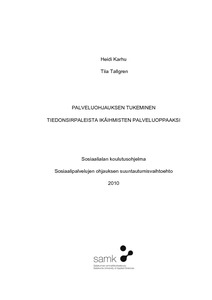 Tämän opinnäytetyön aiheena on palveluohjauksen tukeminen, jonka lisäksi kuvataan ikäihmisille suunnattua palveluopasta eräänä palveluohjauksen työmuotona. Työssä valotetaan myös palveluohjauksen lähtökohtia. Ikäihmisten palveluopasta tarkastellaan etenkin sen mahdollisuuksista ja vaatimuksista lähtien. Työssä tarkastellaan myös oppaan tekoprosessia vaihe vaiheelta. Opinnäytetyössä tarkastellaan lisäksi Kokemäen kaupungin palveluohjauksen nykyistä tilaa sekä sen tulevaisuudennäkymiä.