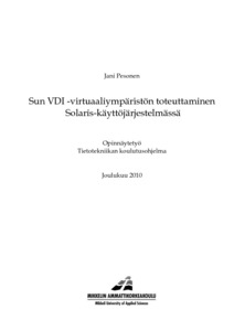 Opinnäytetyöni tarkoituksena oli tutustua virtualisointiin, rakentaa Sun VDI -virtuaaliympäristö ja tutkia sitä Solaris 5.10 –käyttöjärjestelmässä. Tarkoitukseni oli selvittää, mitä asetuksia virtuaaliympäristöön tarvitaan ja mitä asetuksia oli mahdollista tehdä. Lisäksi halusin selvittää myös, mitä virtualisointiin liit-tyvää laitteistoa mahdollisesti tarvitaan.
