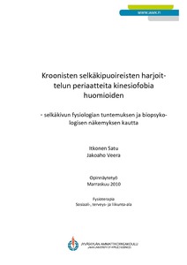 Opinnäytetyön tarkoituksena oli selvittää, miten kinesiofobia ilmenee kroonisen selkäkipuoireisen toimintakyvyssä, ja miten se tulee huomioida fysioterapiassa biopsykososiaalisen lähestymistavan kautta. Työn tavoitteena oli tarkastella kroonista selkäkipua monimuotoisena ongelmana ja perehtyä fyysisen harjoittelun ohella psykososiaaliset tekijät huomioiviin keinoihin.