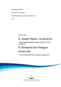 Opinnäytetyöni on kaksiosainen. Taiteellisena osuutena toteutin Sanna Kolan ja Sofia Molinin kanssa yhteisen opinnäytetyöoopperan, Joseph Haydnin intermezzon La canterina. Opinnäytetyöni kirjallisen osan tarkoituksena on esitellä commedia dell’arten ja 1700-luvun opera buffan yhteyttä sekä sitä, miten oopperaa tekevä laulaja voi käyttää commedia dell’arte -tietämystä hyväkseen hahmo- ja juonianalyysissä. Tavoitteena on tehdä näiden kahden taidemuodon historiallinen yhteys ymmärrettäväksi ja osoittaa yhtäläisyyksien hahmottamisen olevan hyödyllistä hahmoanalyysissä ja oopperan rakenteiden hahmottamisessa. Joseph Haydnin oopperaa La canterina ja Domenico Cimarosan oopperaa Il matrimonio segreto käytetään esimerkkeinä siitä, miten ooppera-analyysiä voi lähestyä commedia dell’arten näkökulmasta.